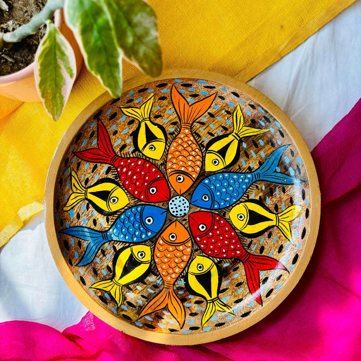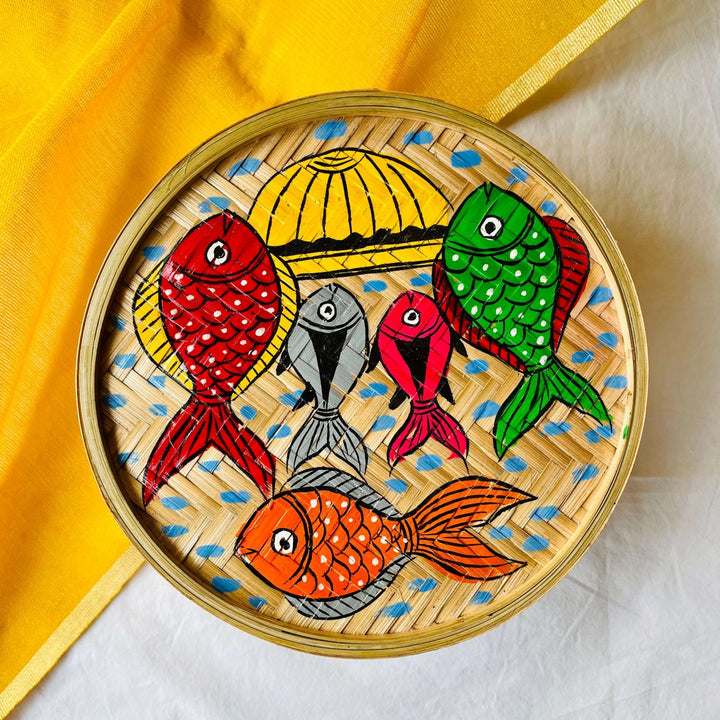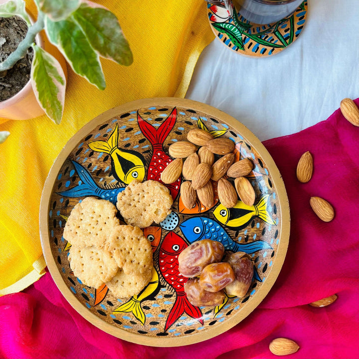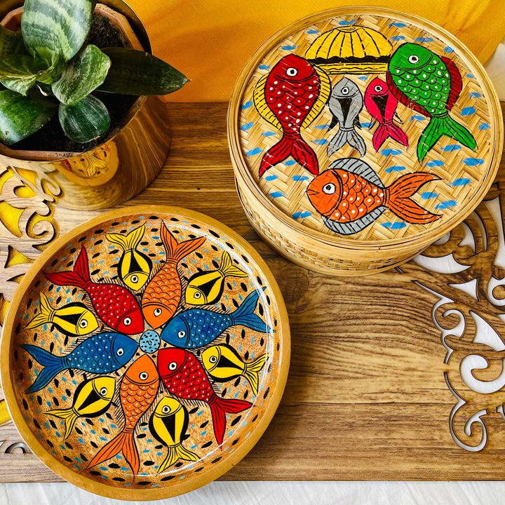 The Leher Hamper 5 is curated with thoughtfully handcrafted Biye Bamboo Utility Box and Taal Round Wooden Platter; all adorned with Pattachitra folk art paintings. Featuring two incredible artworks, every item will be your companion all the way from the dining table to your work table.