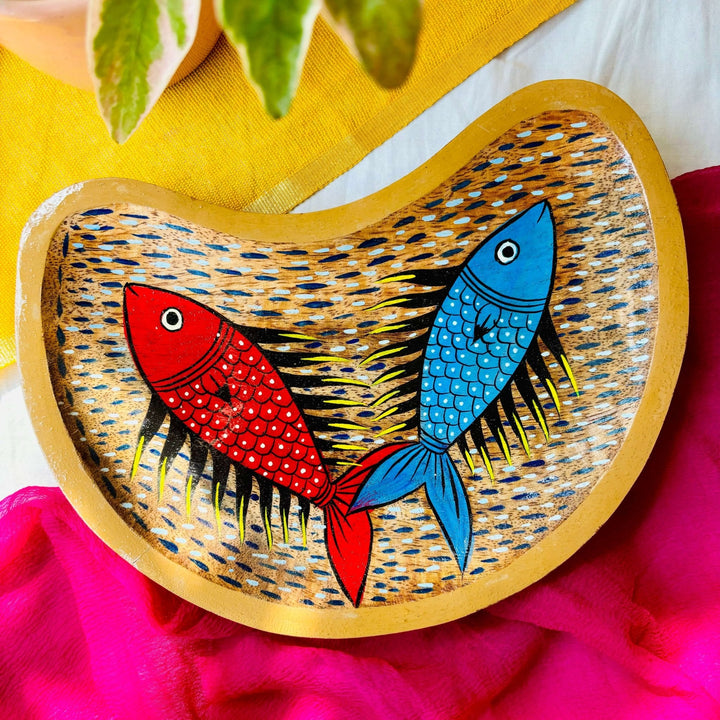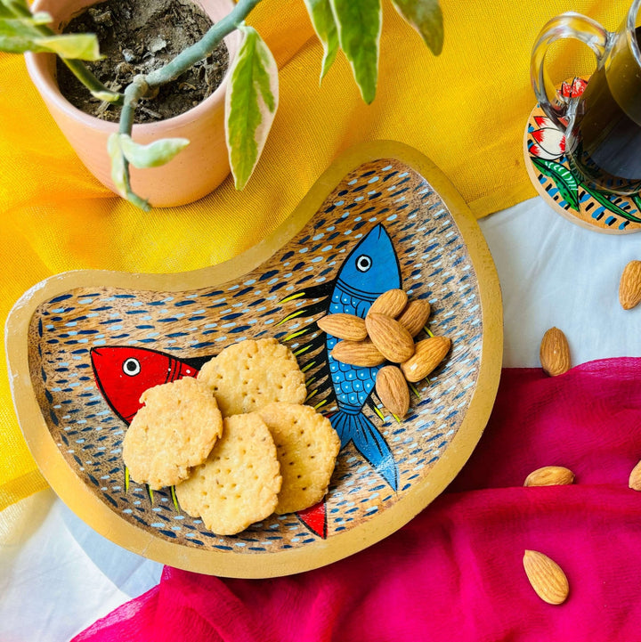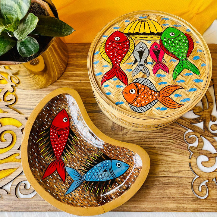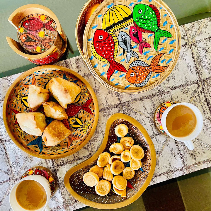 The Leher Hamper 6 is curated with thoughtfully handcrafted Biye Bamboo Utility Box and Dhara Moon Wooden Platter; all adorned with Pattachitra folk art paintings. Featuring two incredible artworks, every item will be your companion all the way from the dining table to your work table.